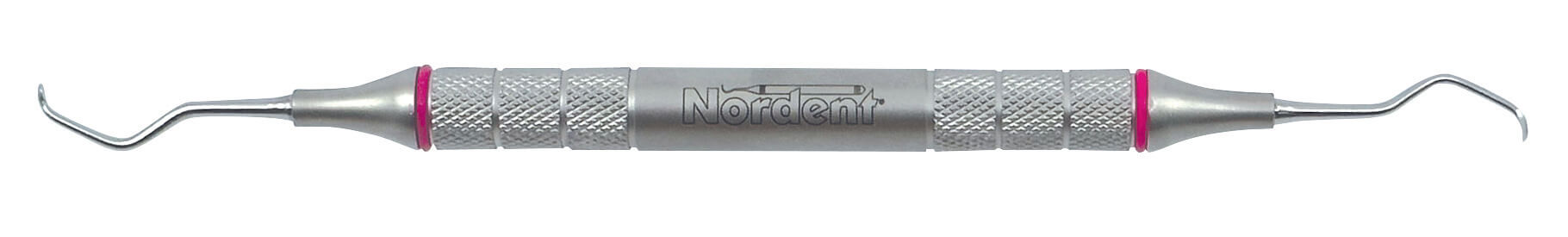 Combines a contra-angled anterior hoe and a contra-angled spoon into one instrument that easily removes stain from anterior lingual surfaces. The hoe has a 2 mm blade width and makes it easy to push back the sulcus as you scale along the gum-line. The spoon has a 2 mm diameter blade that easily adapts to the concavities and grooves of the upper lingual anatomy. Featuring our DuraLite Round Handle, additional handle options are shown below.